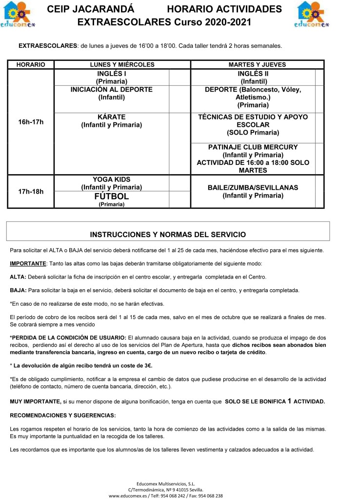 La empresa EDUCOMEX es la encargada de la concesión del servicio público de actividades extraescolares en nuestro centro escolar en la modalidad de concesión por parte de la Agencia Pública Andaluza de Educación